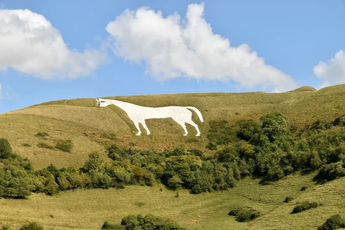The White Horse is visible from afar and is a famous local landscape. Local records suggest that the horse was originally cut in the late 1600s, probably to commemorate the supposed Battle of Ethandun, thought to have taken place at Bratton Camp in AD 878.