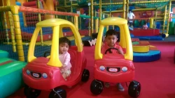 The play area is arranged in a horseshoe shape, with a baby zone in the middle featuring a mushroom-shaped bouncy castle, ball pool, cars, and soft toys for under-3s. Older children can climb towers, crawl through tunnels, and race down the big slide, while parents relax in the on-site café offering coffee, tea, hot chocolate, slush puppies, and ice lollies.