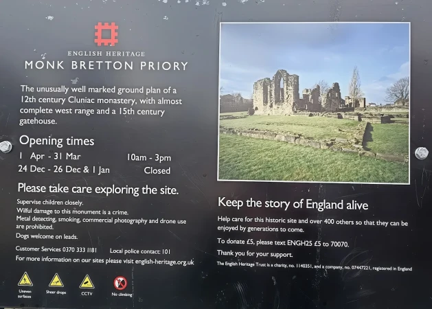 Monk Bretton Priory On the edge of Barnsley stand the substantial remains of Monk Bretton Priory, a Cluniac monastery founded in the 12th century. Today visitors can see the unusually well-marked ground plan, the almost complete west range and the 15th century gatehouse.